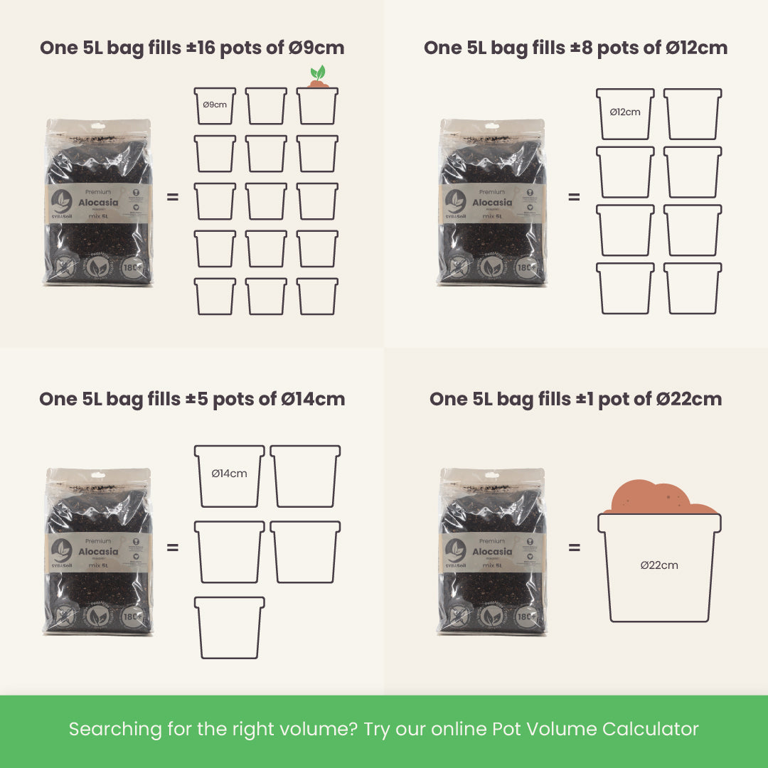Tutustu tähän ruukkujen tilavuuslaskuriin, jolla voit laskea kuinka paljon Alocasia-Multa tarvitset.