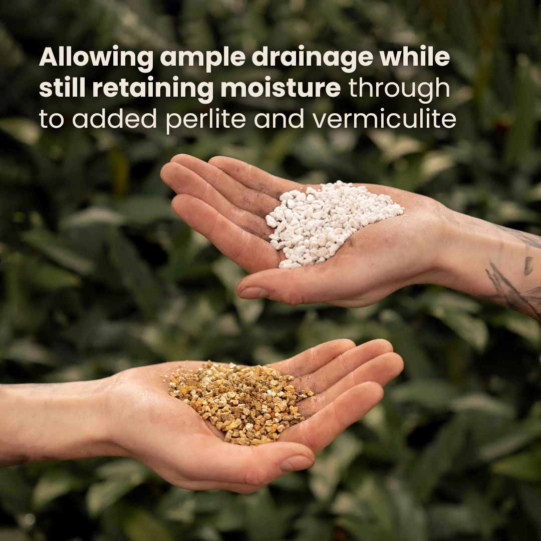 Calathea & Maranta -sekoituksessa on sekä perlit että Vermikuliitti, mikä mahdollistaa riittävän vedenpoiston samalla kun se säilyttää hieman kosteutta Vermikuliitti:ssa. Tämä auttaa pitämään maan tasaisesti kosteana. Juurijärjestelmä kasvaa terveemmäksi ja suuremmaksi, ja se vähentää tarpeen kastella kasvia liian usein, jättäen sinulle enemmän aikaa ihailla kasvejasi!