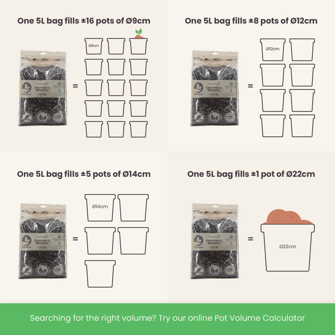 Tutustu tähän ruukkujen tilavuuslaskuriin, jolla voit laskea kuinka paljon Calathea & Maranta-multa tarvitset.